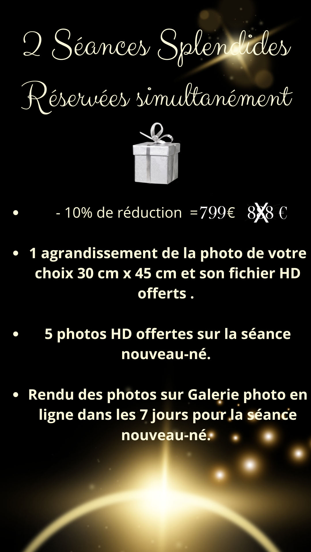 Vous avez la possibilité de réserver simultanément 2 séances ( 1 séance grossesse + 1 séance nouveau-né) et d’obtenir une réduction de -10 % sur le prix total.